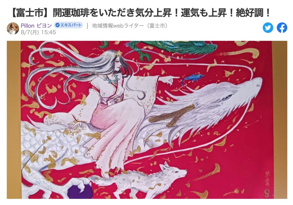 YAHOO! ニュース Pillon ピヨンさんがご紹介くださいました。【富士市】開運珈琲をいただき気分上昇!運気も上昇!絶好調! 共有: クリックして X で共有 (新しいウィンドウで開きます) X Facebook で共有するにはクリックしてください (新しいウィンドウで開きます) Facebook いいね 読み込み中…
